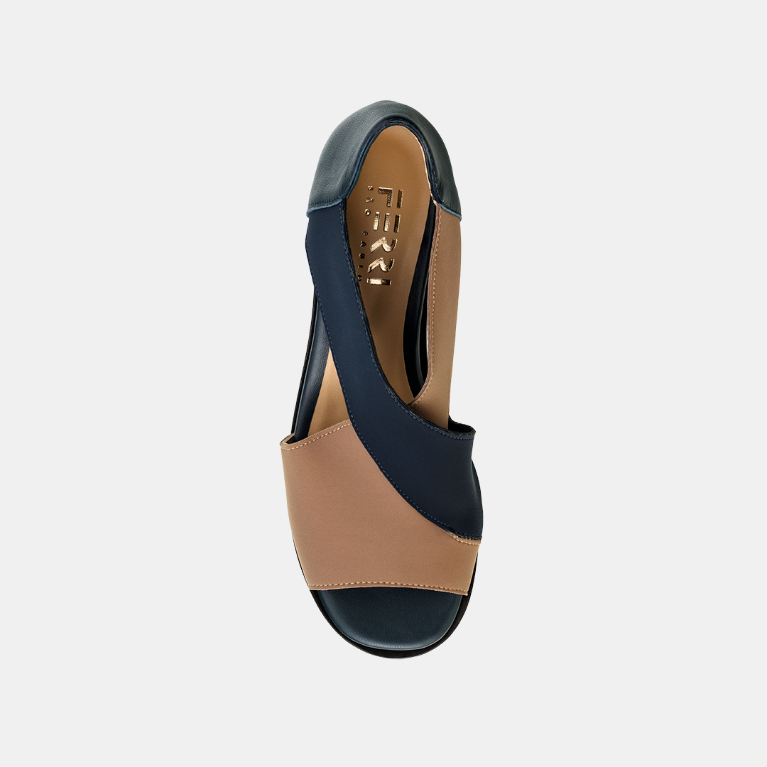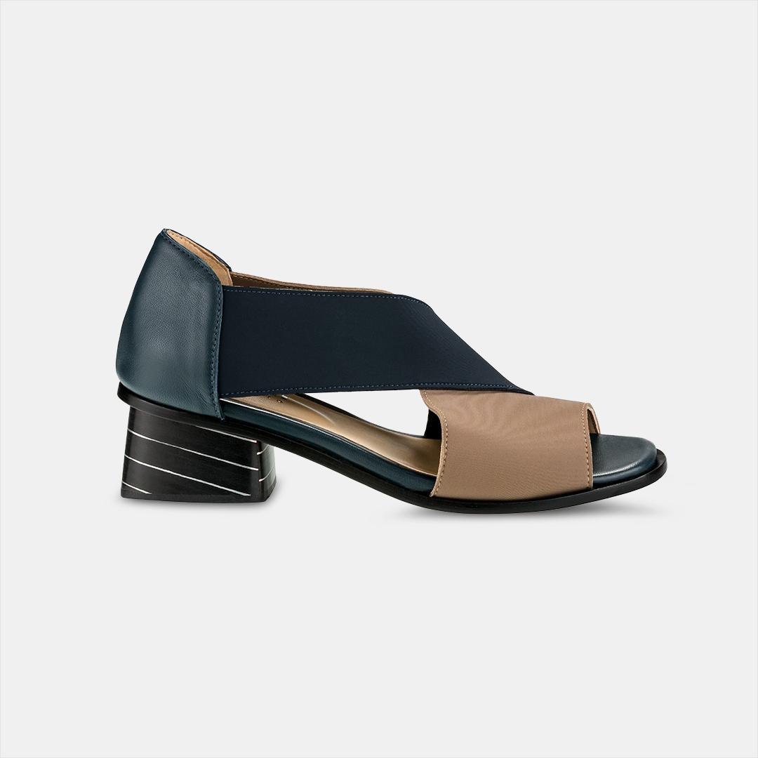 Sandália em Neoprene em Azul Marinho e Concreto, Traseiro em Couro. Possui biqueira arredondada. Seu salto bloco com nova estampa confere Design e Conforto!